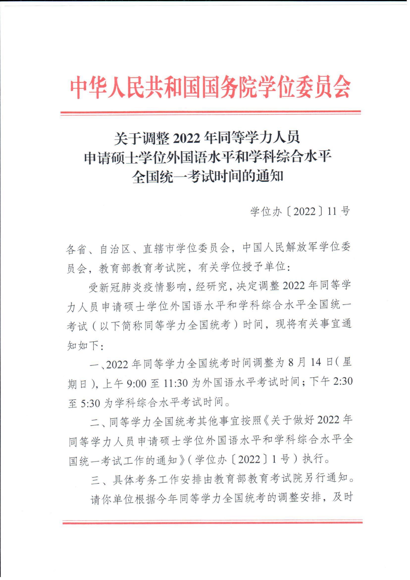 关于调整2022年同等学力人员申请硕士学位外国语水平和学科综合水平全国统一考试时间的通知